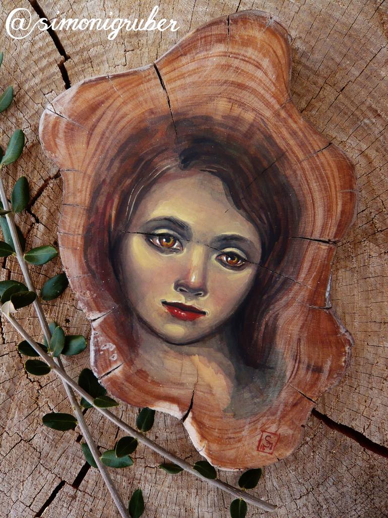 I wondered what the nymph would look like so I let this slice of olive wood guide me. It was worked by layering watercolor and it was finished with some layers of matte varnish. The woodslice has natural cracks and flaws.
