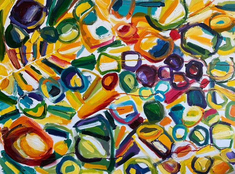 This happy oil painting is inspired by memories I have of getting away to tropical settings to enjoy nature, sea, sun and the flora and fauna. I started with memories and photographs and intended to reduce my use of color with a focus on yellow. I kept the painting title as "The Yellow Painting" a...