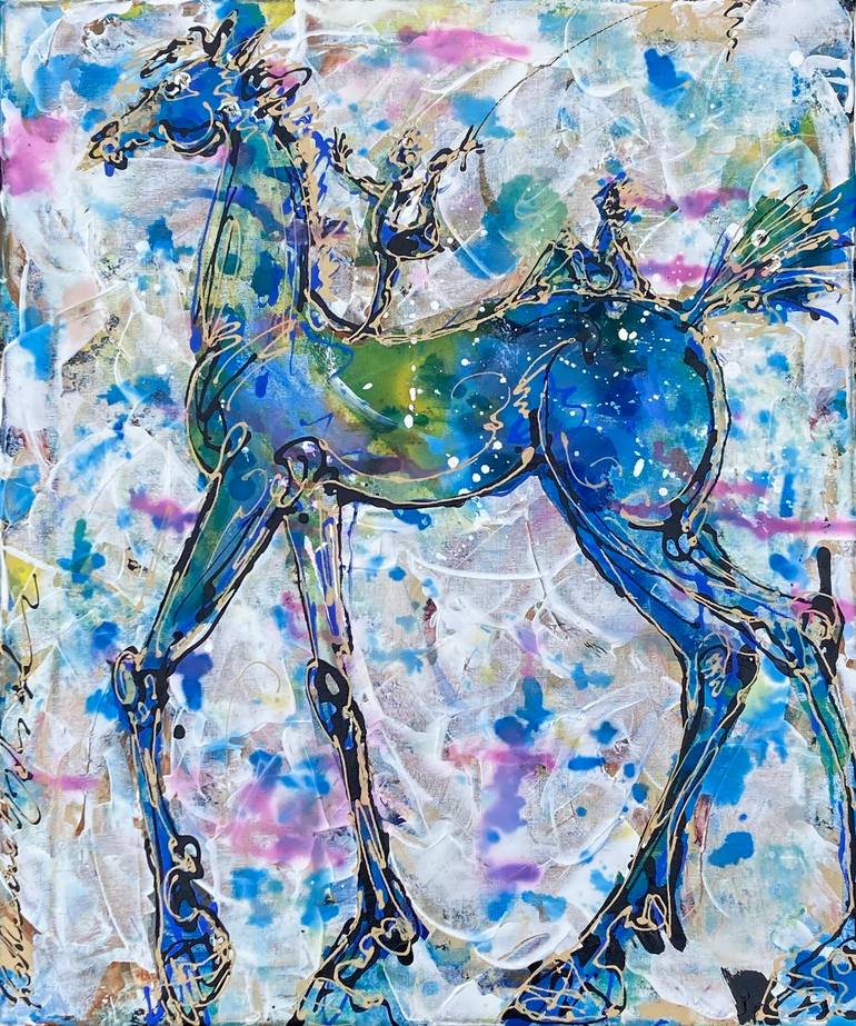 My dreamlike interpretation of equine movement, where a horse appears to dance between reality and fantasy. The ethereal blue tones and fluid linework create a sense of weightlessness, while the splashed inks and dyes suggest a dream state where physical boundaries dissolve. The dynamic pose capture...