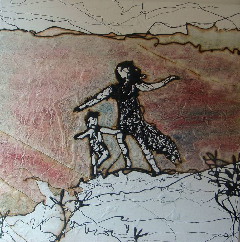 Over the last 10 years I have dripped bitumen paint on to canvas, creating figures, and stories that hold a variety of conceptual meanings. 'The act of creation' uses the movement of figures in black and white, with a textured pink-purple block of colour to represent the gendered activity of teachin...