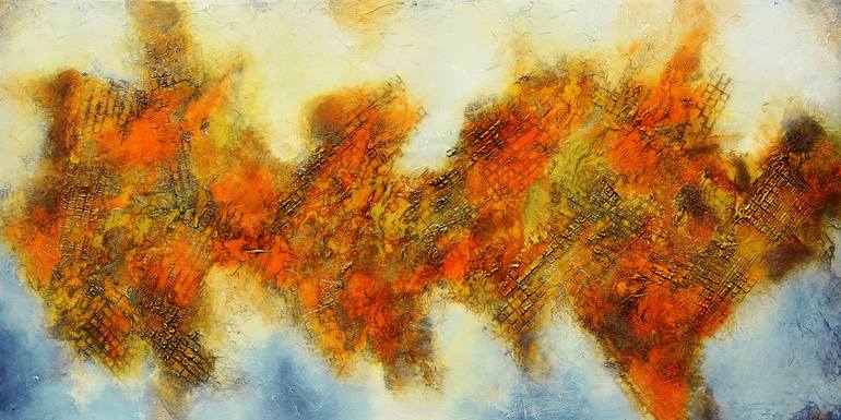 Textured original abstract painting with orange, grey and beige. This painting is created with unique textures and brush strokes and is a great conversation starter. - Title: The Ancient City of the desert - Dimensions: 72" x 36" x 1.5" - Support: Stretched Canvas, ready to hang. - Medium: Mixed med...