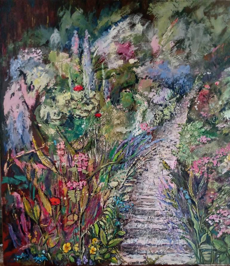I saw a garden, slightly ascending with a path, I felt the urge to follow that path with flowers and plants( I do not know the names) on the sides, but a bit rough. I was curious. In the back of the garden were more shrubs and trees and there was shadow. I would like it, if you had the feeling I had...