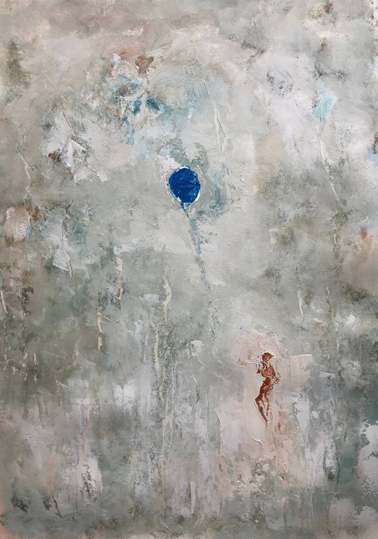 This is an oil painting on special high quality oil paper 450gr. The paper is 100-70cm,but the painting itself is a little smaller. Framed it is 100-70cm. The balloon is sign of hope. The painting has to dry now and can be delivered about March 2022.