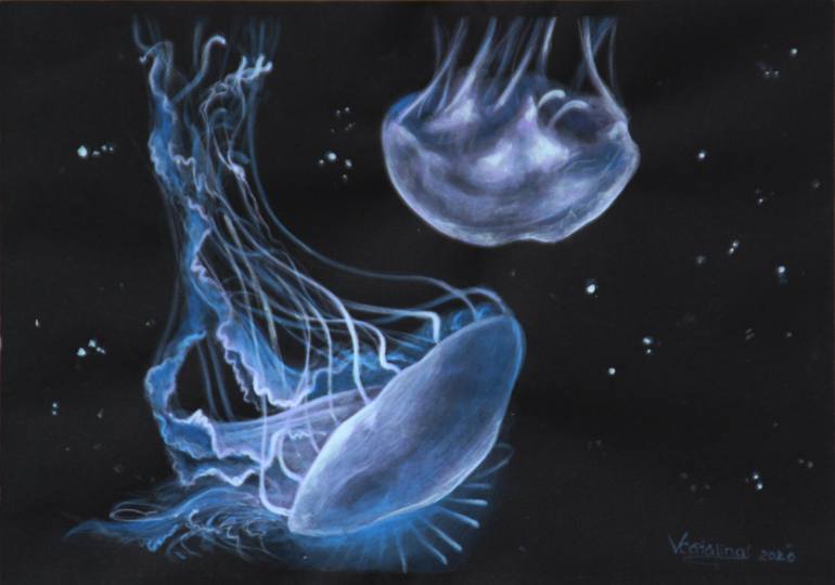 Acrylic painting on paper made in detail, framed.The overall dimension with the frame is 43/32 / cm and without the frame is 20/29 cm. I used phosphorescent colors, so you can see in the darkness the beauty of the deep sea.I hope this work will give the feeling of relaxation, release and floating. T...