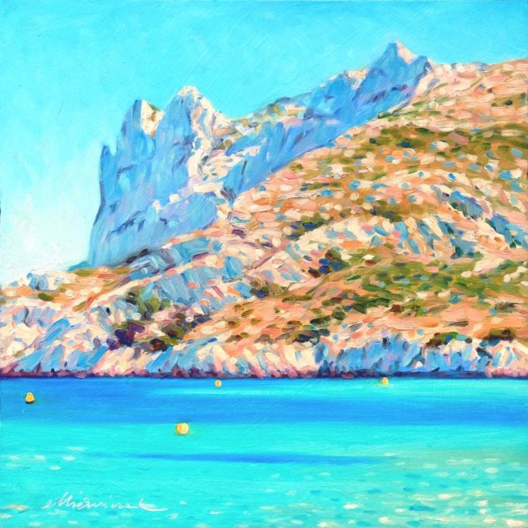 Theme from the south of France - Calanque du Sormiou. This landscape is painted in "alla prima" technique. The paint carrier is MDF-Board primed three times. The materials used for the painting are of a high professional quality, which guarantees a high longevity and color fastness of the painting....
