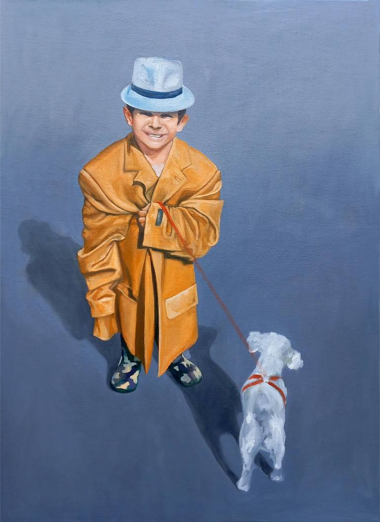 I took a photo of my son during a walk with the dog. The boy was cold, so I covered him with a jacket. It was an unforgettable scene.
