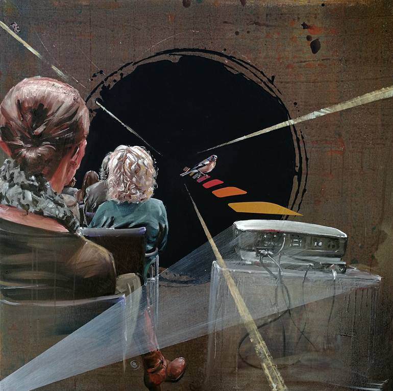 This piece of art is a mixture of minimal geometrical and classic alla prima figurative painting. The picture is about delicate balance: a sensitive creature - in this case a bird - is equilibrating in a delicate string system - like our nature / world, and this "still - life" is painted on a rough ...