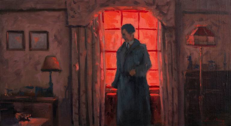 This work represents a pictorial experiment in which the artist seeks to break away from their usual style. The scene depicts a figure dressed to go out, evoking the elegance of the 1920s. It is set in an English-style interior, with a window allowing red light from the street to enter, giving the a...