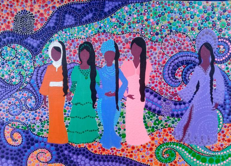 My painting, 'The Daughters of Zelophehad'. 17 inches x 12 inches. Acrylic dots on primed canvas. It will be shipped in a roll. It is inspired by 5 sisters in Biblical times who dared to challenge the patriarchal inheritance laws of their tradition. Today many are groaning under unfair traditio...