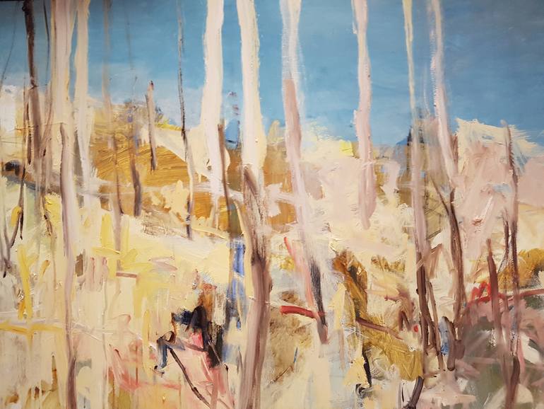 sitting with the landscape, the sounds of cicada pressing against your eardrums. The light threads through the gums that stand proud on the hillside. Shades of pinks and violets. The bush is my inspiration with history and landscape and contemporary landscape pushing against the canvas.