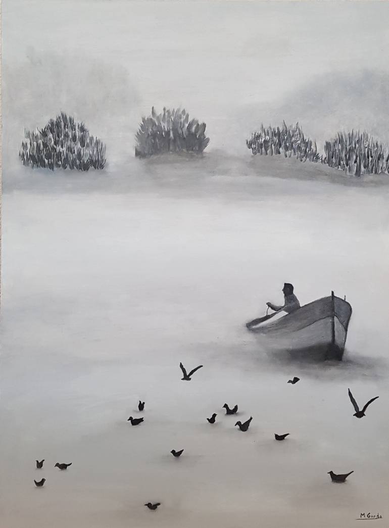 Oil on wood Landscape of a fisherman wrapped in a mysterious fog that invades the lagoon