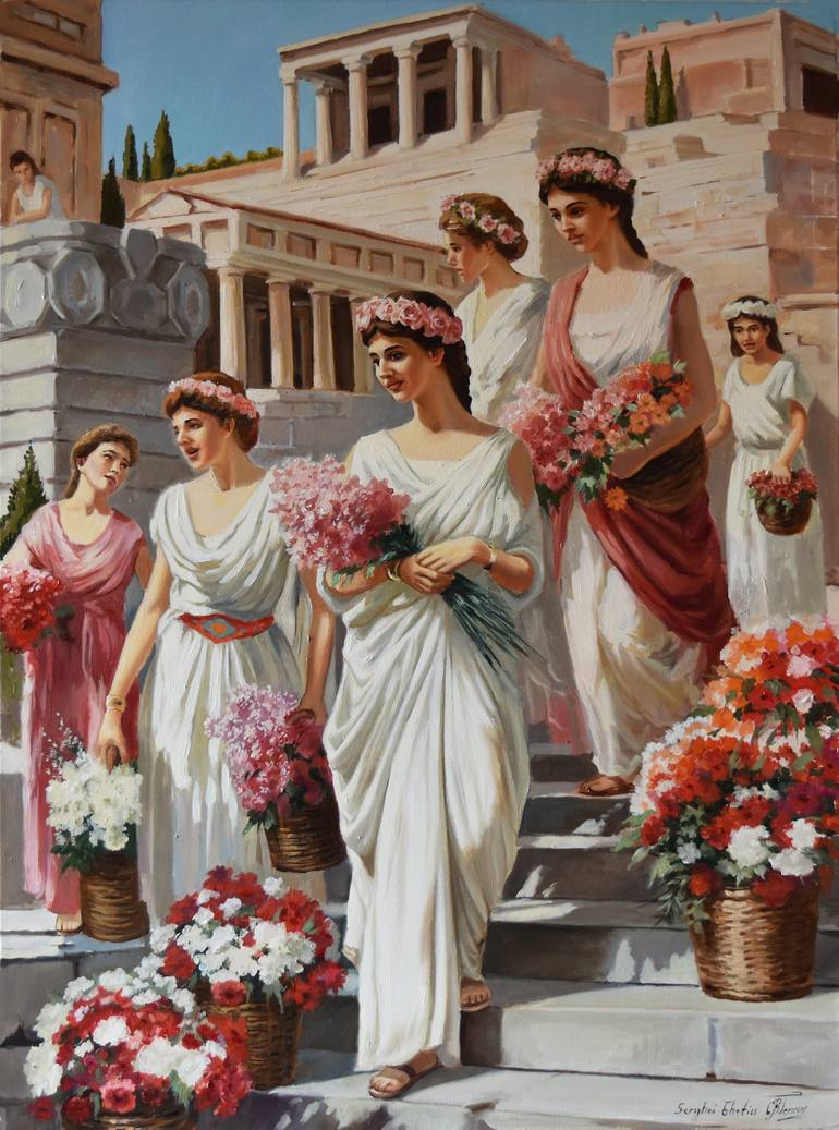 In this painting, I captured the vibrant spirit and grace of flower sellers in ancient Rome. Using oil, I blended realism with impressionistic touches to bring their joyful energy to life. Their flowing robes and delicate blossoms symbolize beauty and tradition, inviting warmth and timeless elegance...
