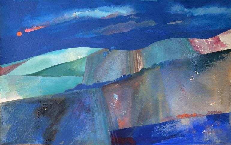 a moonlit night, dreaming of new worlds, a future of exploration, staying calm and dreaming in the warm October of the Italian hills Watercolor and acrylic and tempera on an heavy and rought watercolor paper,