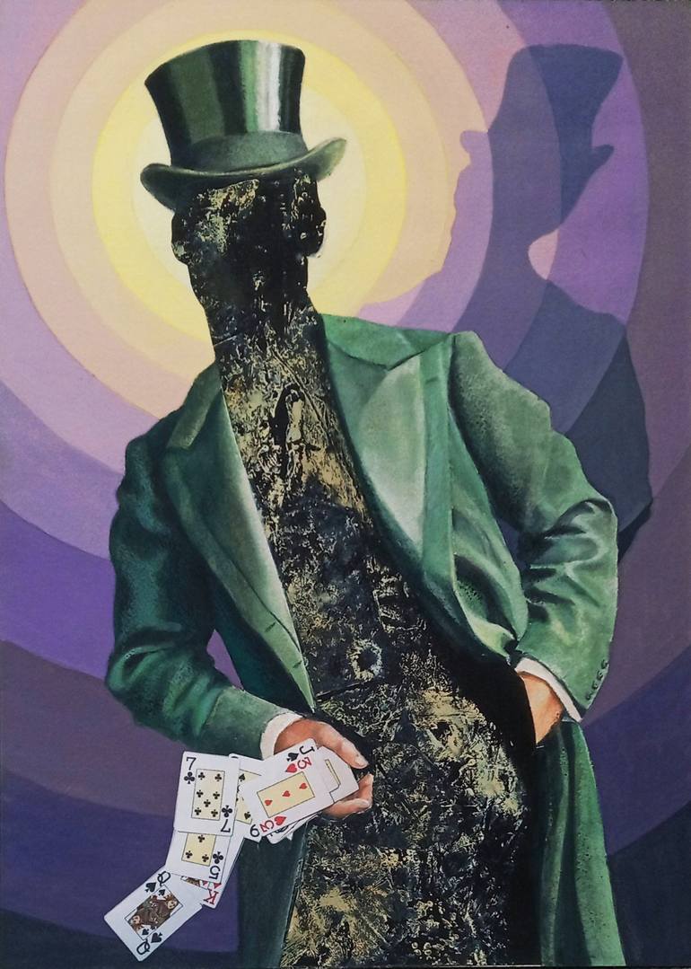 In this work I combine the realistic clothing with an abstract stain in the place where the person should be. With this and with the silhouette I want to express the hermetic attitude of the players sitting around a game table.