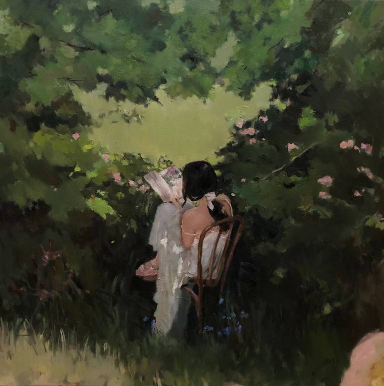In working on this painting, the author has completely become peaceful and reunited with nature. The girl who's made in a gentle dress who's reading a book is a deep soul filling and harmony that can be found in the fresh air of thick trees. On vacation that people sometimes need.