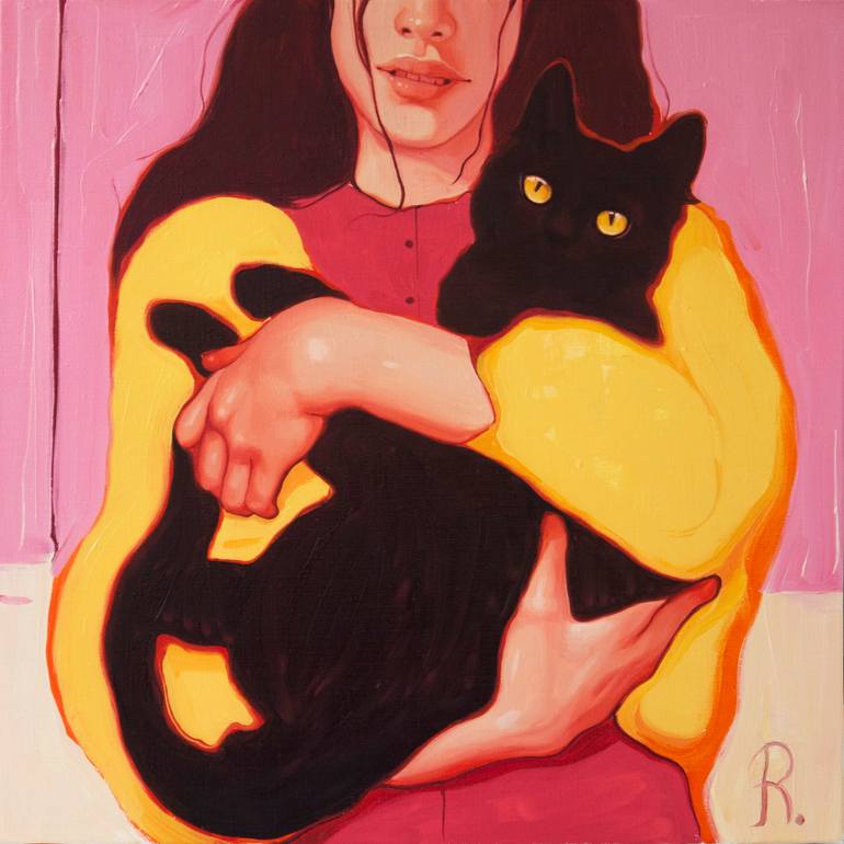 The girl with black cat Oil painting, Canvas One of a kind artwork Size: 50 × 50 × 2 cm (unframed) Original Created: 2021 This artwork is sold unframed The artwork is titled and signed on the front and also comes with a certificate of authenticity. In this series of works my love of animals is close...
