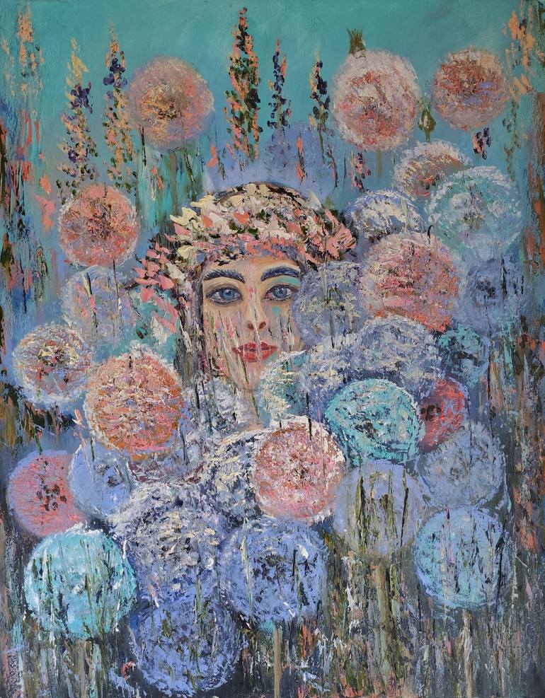 "The Girl with Dandelions" is an oil painting on canvas measuring 70x90 cm, created in an impressionist style that celebrates delicacy and color. The artwork portrays the face of a young woman immersed in a sea of ethereal, multicolored dandelions that seem to dance around her like a spring breeze. ...