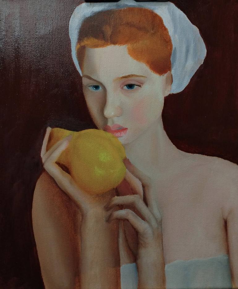 This painting was painted in oil on white canvas. The canvas depicts a girl holding a pumpkin