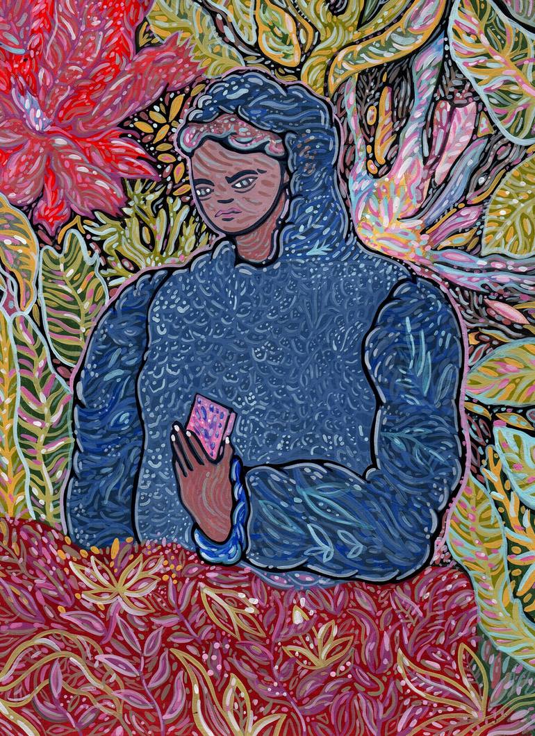 The painting is a visual representation of a dream-like state that evokes a sense of weightlessness and vitality branching out like vegetation. The artist used acrylic on paper to create a detailed and captivating visual experience that suggests the feeling of a dream in constant flux.