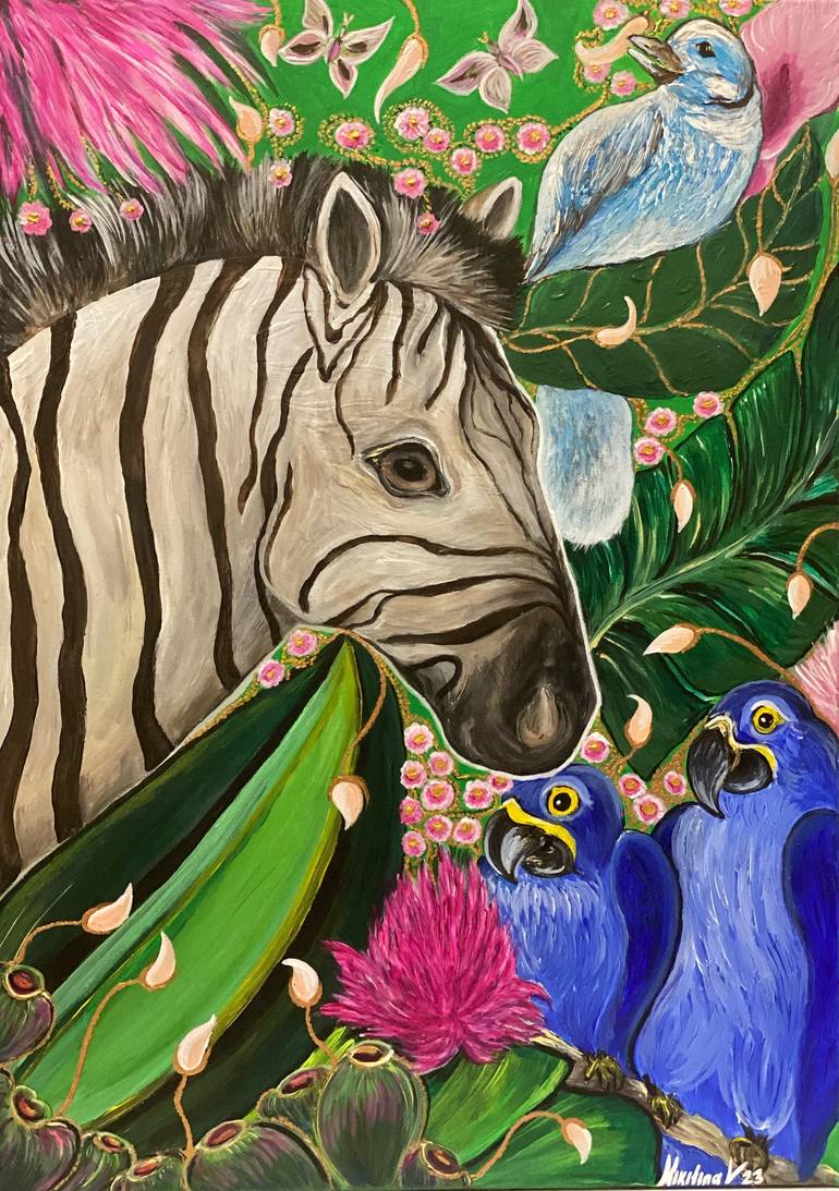 The jungle book. The author of this painting was inspired by Rudyard Kipling's wonderful stories about the jungle and animal life. The painting is uncommon, bright and joyful. Against a background of tropical plants and flowers, a zebra, birds and parrots are depicted in harmony with each other. A...
