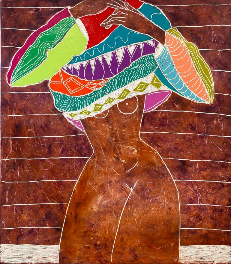 A highly stylized female figure in soft colors. I used rich colors and deep texture. This is a portrait of one of those moments when I wake up in the stillness of the dawn. Calm, quiet, gentle morning. In no hurry.
