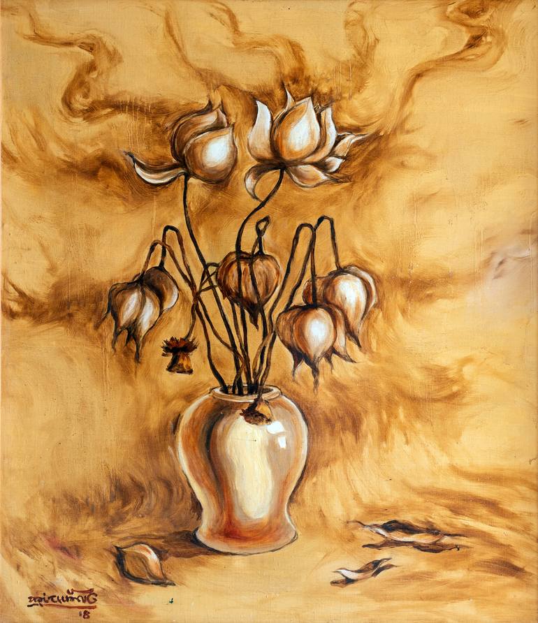 When standing in front of the lotus image about to fade, emotions surged in me, like a regret, at the present beauty but ended so quickly, the oil painting I painted in 2018, was the emotion. shivered at the Asian beauty of the lotus, but soon faded, like: good people don't live long, beauty is not ...