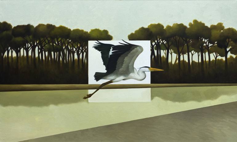 A flight of a heron in a wonderful and mysterious timeless world. In my paintings I hope to convey a sense of suspension, of calm, of timeless peace. Oil on canvas is my preferred technique: it allows me to get brightness and transparency.