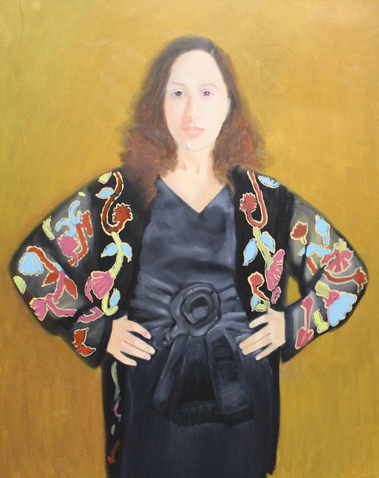 I posed the model in a colorful blouse; I'd wanted to paint the blouse for a long time because it was so strikingly colorful. I also had her put on a black dress I'd had for some time and it fit her pretty well. I think it worked.