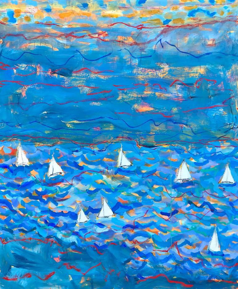 This painting shows more or less my surroundings where I live in Denmark. The Baltic Ocean is right outside my windows and sailing is in my DNA. The combination of the 'blue water', the sailboats, the landscape and the open sky define what is home to me! The painting has a nice frame of wood - silve...