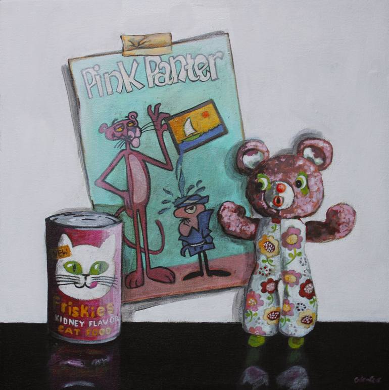 I was inspired by the humour of a constructed situation. The still life is a foray into the land of fantasy, the surprised bear interacts with the slapstick of the scene on the magazine while the cat looks on. All is brought together by the pop-art pink and blue.