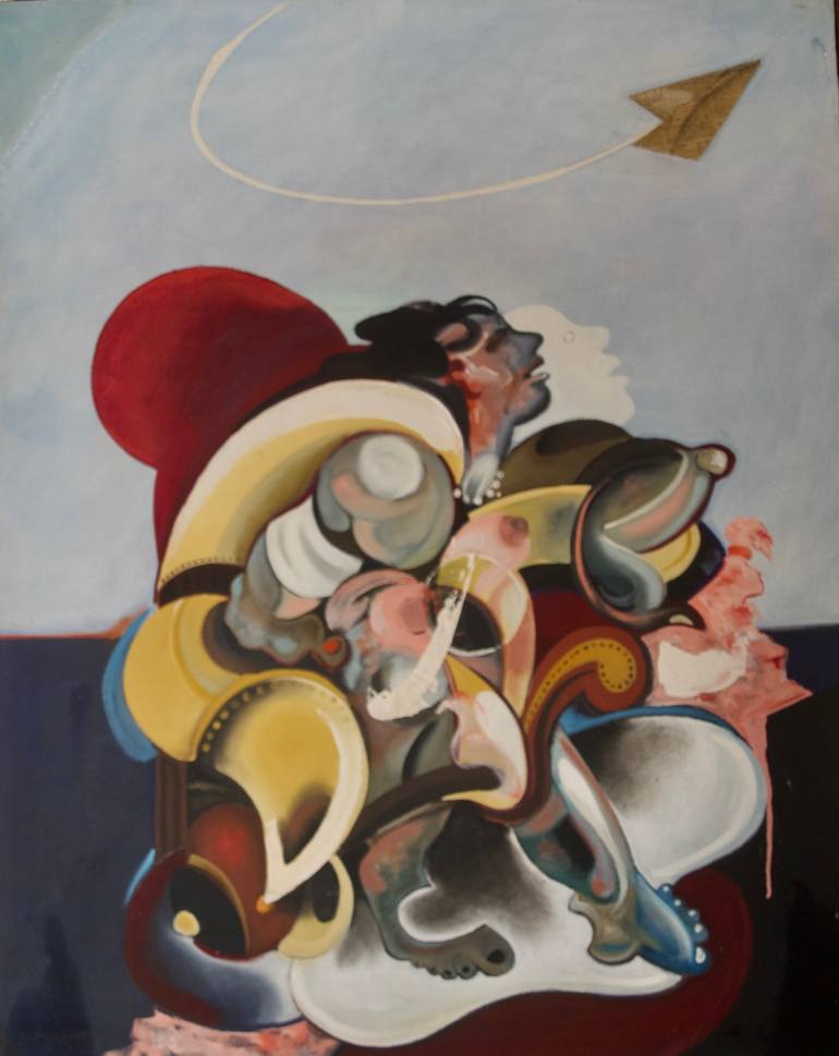 Happy charachter (male or female?) watching a paper plane going through the space. happy, light feeling.