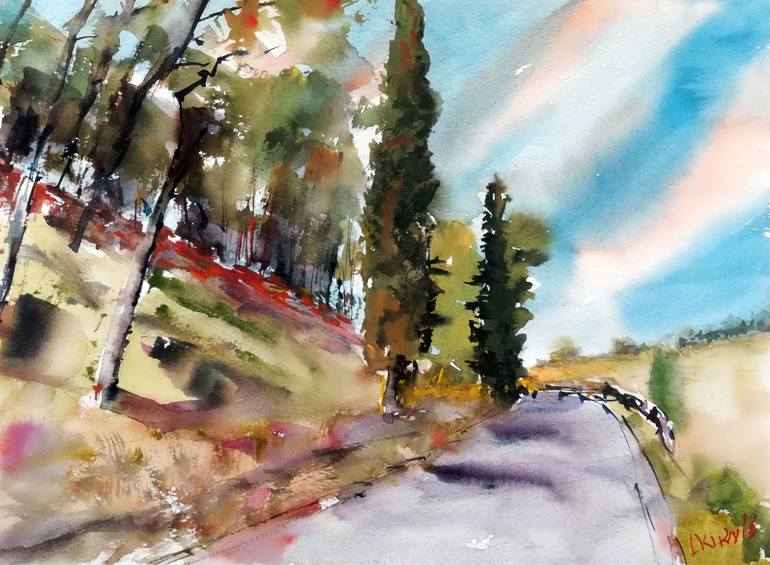 This is watercolor painting made on location. Sunny say, forest, and small road. Only watercolor can reflect this brilliant transparency of nature