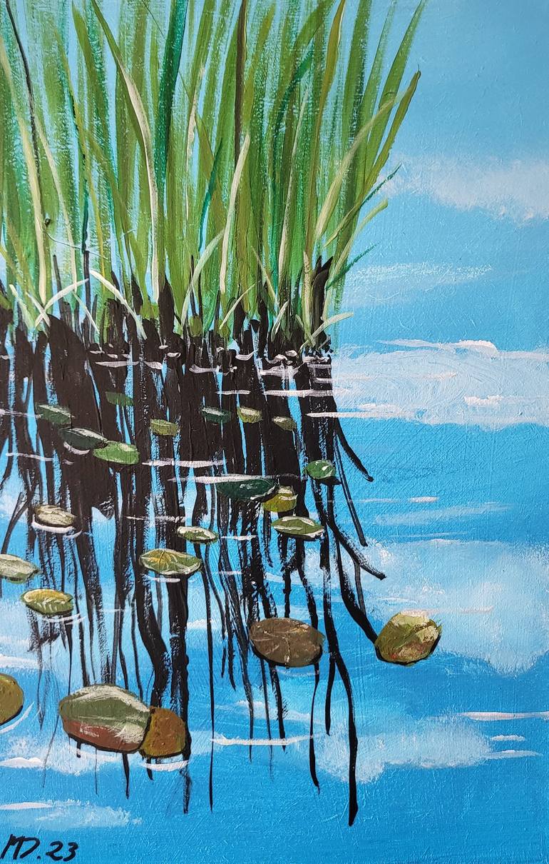 This is a painting I’ve done of a pond with some grasses growing out of it. A simple setting, but a strong image, with all its bright and dark contrasting colours. The painting is done with premium acrylics on prepared hardboard. With these materials, all the vibrant colours and brushstrokes come o...