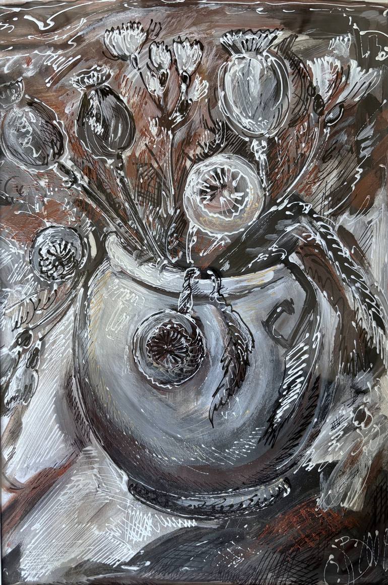 This painting appears to be a still life featuring dried poppy flowers in a rustic vase, rendered in a monochromatic, expressive style with elements of abstraction. The contrast between dark and light tones, along with dynamic brushwork and textured details, gives it a sense of depth and movement. T...