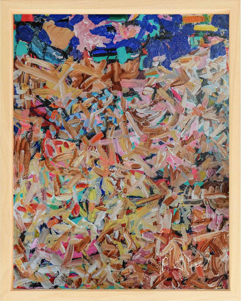 Acrylic and oil paint on preprocessed wooden panel in wooden frame . \Immersed in the dynamic interplay of color and motion, I infused my canvas with the vitality of freedom's essence. This painting embodies the tumultuous journey toward liberation; each stroke resonates with the courage and chaos ...