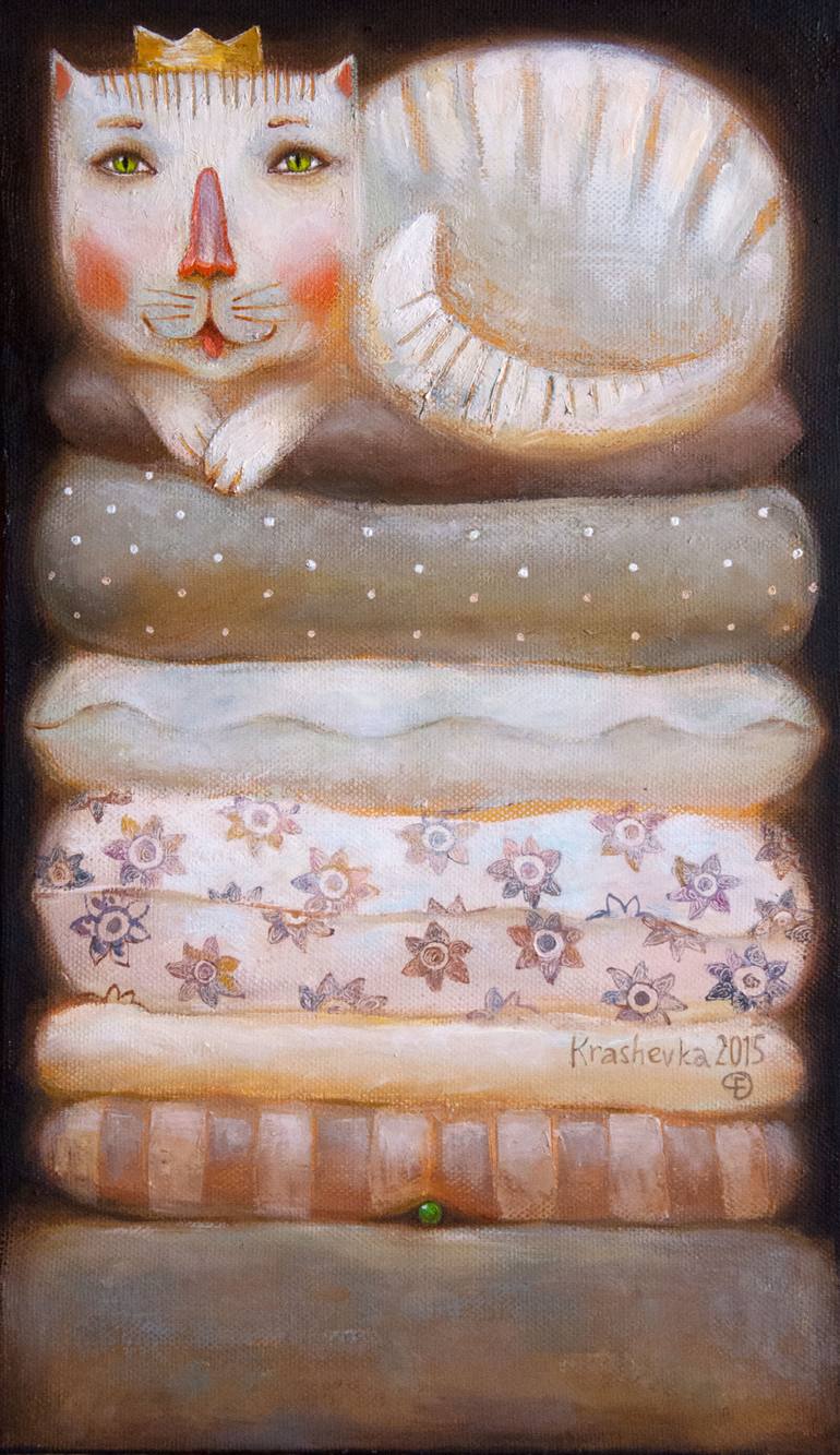 In my painting, I wanted to capture the whimsical essence of fairy tales through the eyes of a playful, yet serene, feline character atop a stack of ornately patterned mattresses. Using a naive style with oil paints, I’ve infused a soft, ethereal quality that both charms and calms, inviting viewers ...