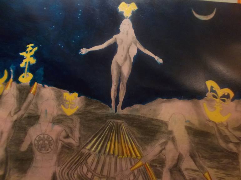 The image represents the end of a legend Muisca, the princess of Guatavita when it emerges from the waters of the lagoon of the same name in the lunar station that indicates the legend, while it is venerated by 6 muiscas that carry superaturally votive gold pieces of different cultures Mesoamerican ...