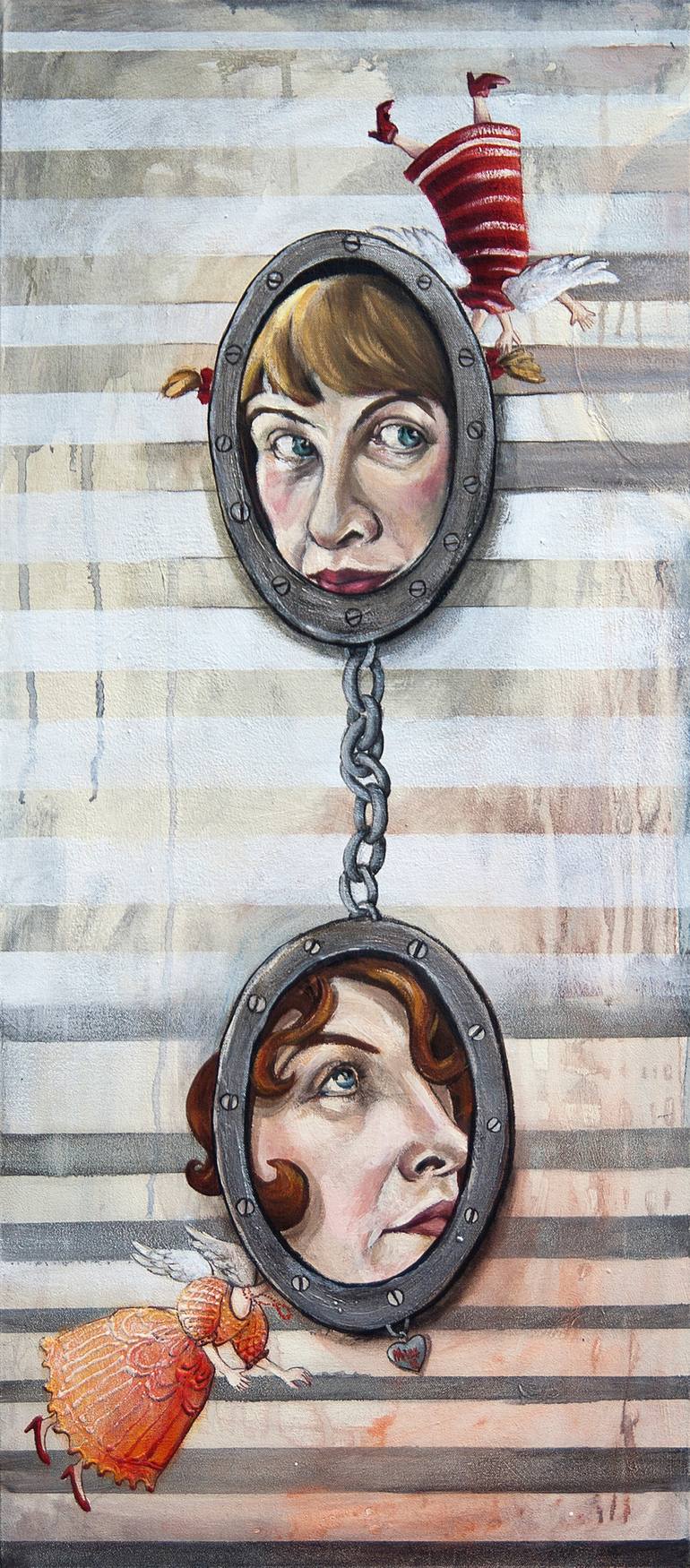 This painting is made with acrylic on canvas, it represents two little women-angels, floating in the air, flying, but chained together. All this is painted on a background of more or less gray stripes - like the clothes of a prisoner :) ... Actually any freedom has limits, at least - one is always c...