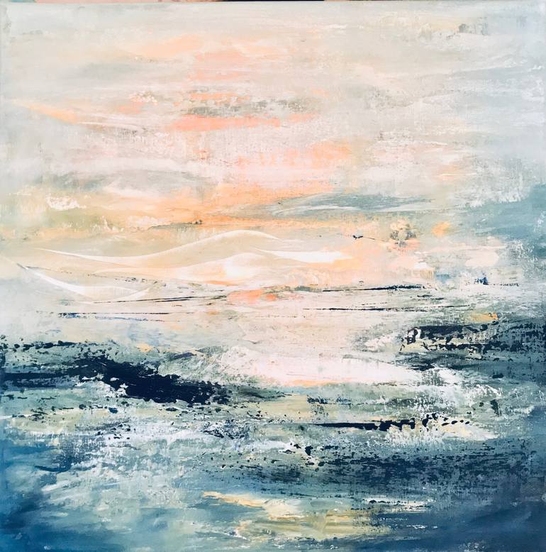 Large abstract painting with water effect. Original abstract expressionism art. 60 cm x 60 cm x 1.8 cm Original painting. Large painting in blue, yellow, greyblue, green, white and a little bit orange. Modern abstract artwork. Year 2020, made by Julia Britvich