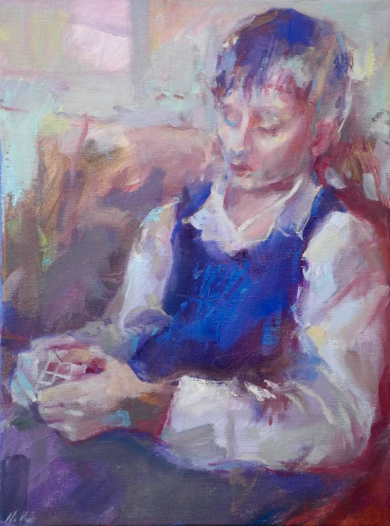 The subject of the painting is a seemingly ordinary scene depicting a boy solving a Rubik's Cube. Using strongly interacting colors, expressive brushstrokes, and a frame focused on the boy's face and hands, the work takes the form of a mystery and an invitation to an intimate moment full of reflecti...