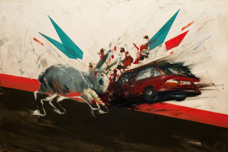 In his artworks, Cristian Ienciu begets acute dramatic tensions, engendered by strong lines and large imposing shapes on whose background there are often placed social narrative sections. These visual social pamphlets are usually approached in a sarcasm key, black humor and/ or absurd, filtered through the new media lens, with which the modern man involuntarily interacts daily. Initially, the viewer is approached almost aggressively by chromatic contrast and space abundance. Subsequently, apparent common subjects raise questions and interpretations in the viewer's mind. These interpretations are nourished by a so called abandon of work surface, the artist preferring vast spaces left void in the background.