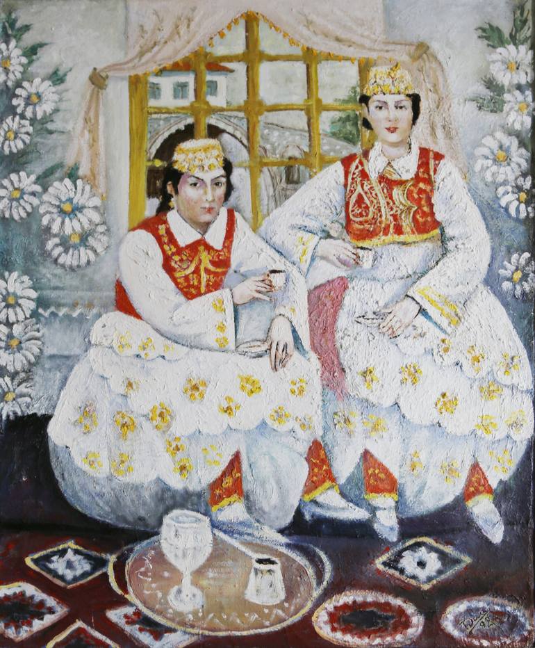 In this tableau there have been painted two sisters drinking coffee. The sisters are dressed in traditional costumes of West Albania.