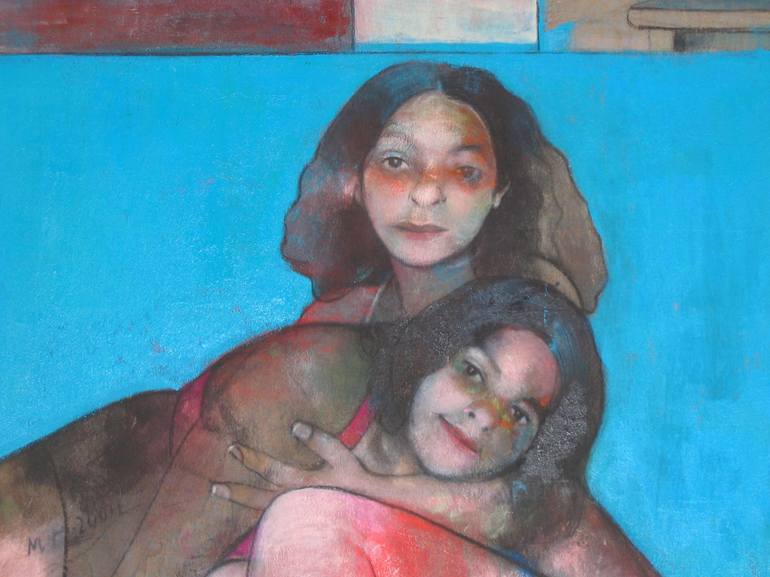 Portrait of two sisters holding one another in a backdrop of light blue