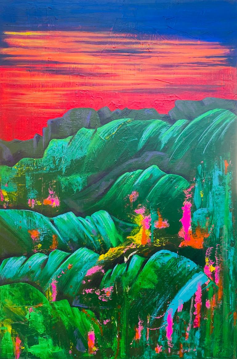 The mountains surrounding my home in Andalucia are beautiful beyond compare. At dusk the colours change from minute to minute until the darkest hues are left. The sleeping giants are restful, soulful, waiting for something to awake them from their slumber Premium Professional Acrylics on Canvas, usi...