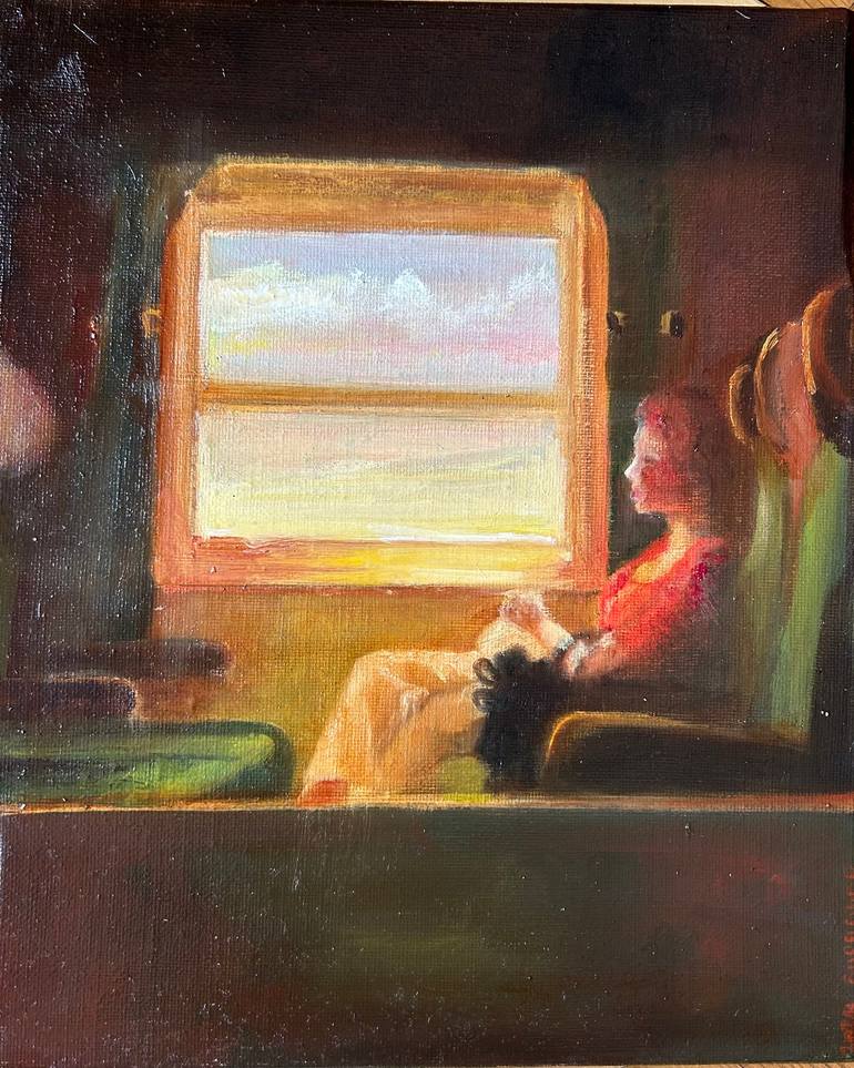 In this painting by Lisbeth Buonanno, a woman elegantly seated in a vintage train carriage appears lost in thought. The interior, with its velvet seats and old wooden paneling, subtly contrasts with the outside view: a pink sea stretches endlessly, bathing the horizon in a soft, almost surreal light...