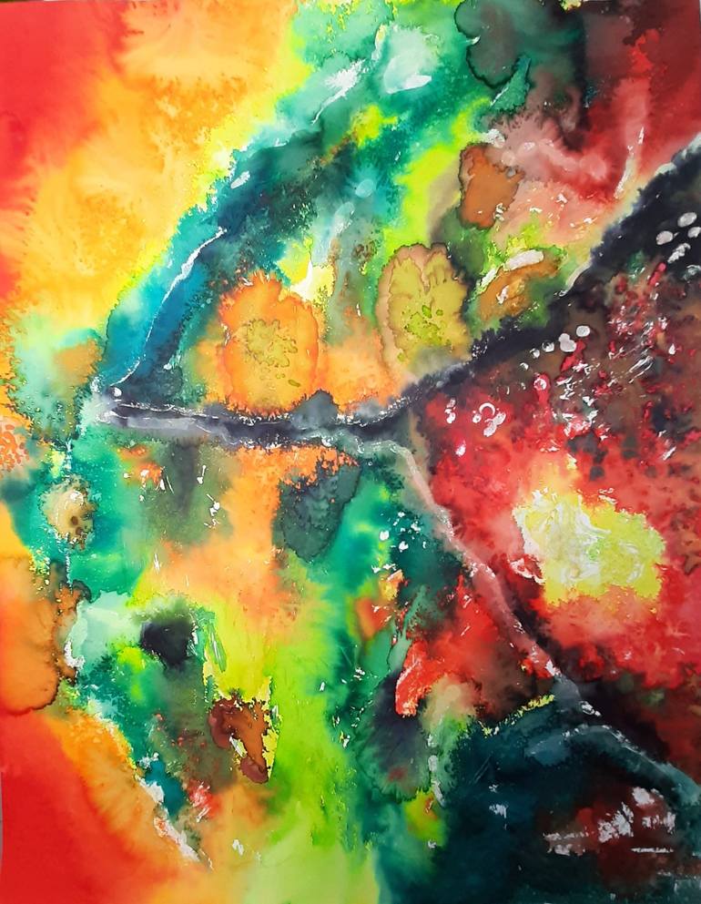 The universe of rust. Time can paint, carve and spill whole worlds on metal surfaces. Oxidation, rain, moisture, various factors can provoke explosions of colors and configurations. Natural painting. The watercolor painting is framed with conservation glass.