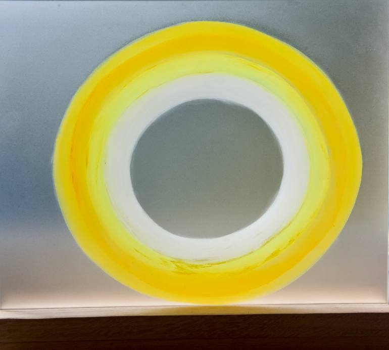 This is the second painting of the sun, painted after the winter sun which is softer and painted on a lighter reflective glass. The spring sun is stronger, more vibrant and warmer, positioned a bit higher from it's horizon, still touching the standard. This is a meeting with the layers and the colou...