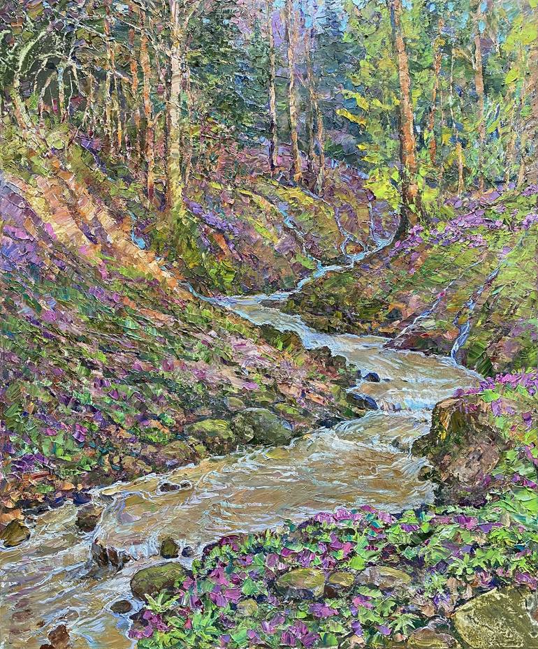 The springs of a mountain stream” presents Aleksandr Dubrovskyy’s impressionist vision of spring in the highlands. The rapid flow of water, painted with expressive energy, winds through a forest of awakening colors. Each brushstroke is infused with light, capturing both the movement of water and the...