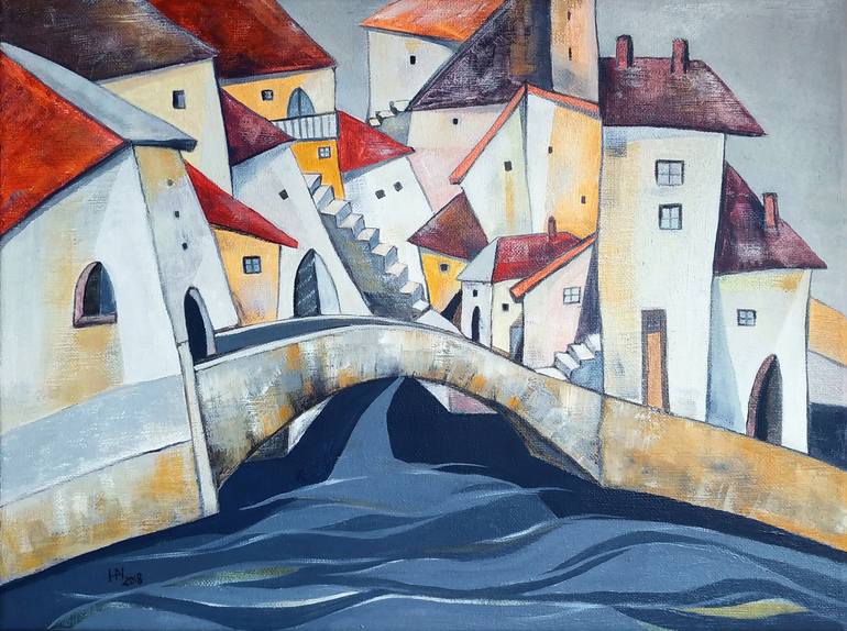 Original abstract cityscape with houses, stairs and a stone bridge over the river. The artwork is made with oil painting on canvas. The painting is signed in front (+back) and accompanied with a certificate of authenticity signed by me. It is varnished in order to give it a not too shiny, satin sur...
