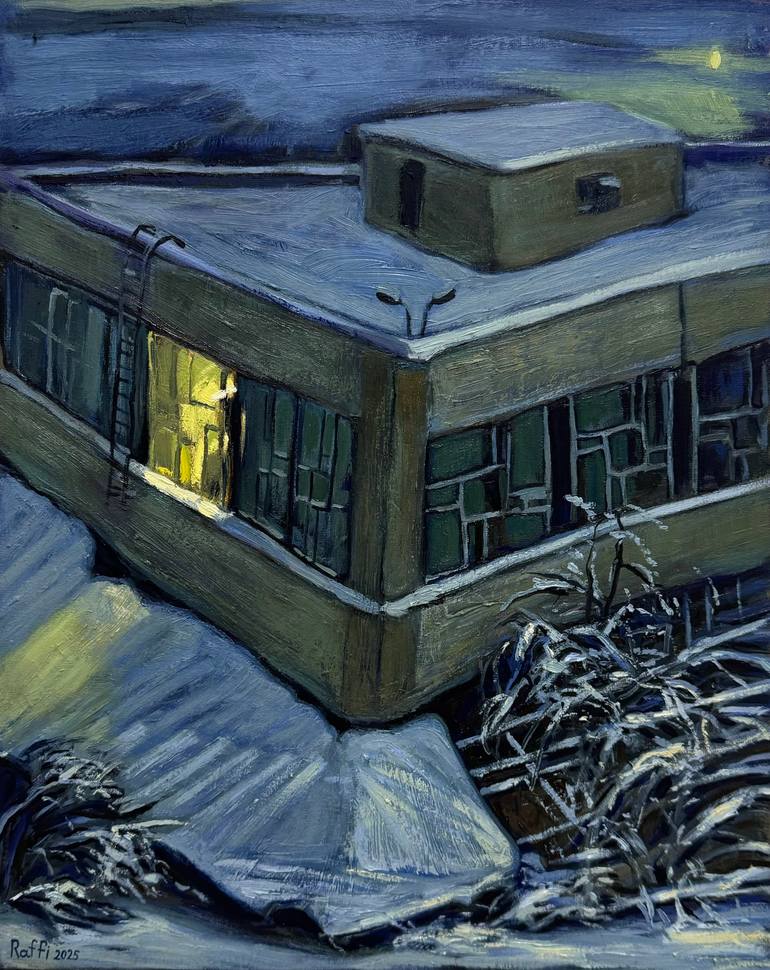 This painting conveys the mysterious atmosphere of a winter night, emphasizing a sense of solitude, silence, and hidden stories. The cool, bluish tones create an impression of depth in the snow and darkness, while the warm, yellow light from the illuminated window contrasts with the overall coldness...